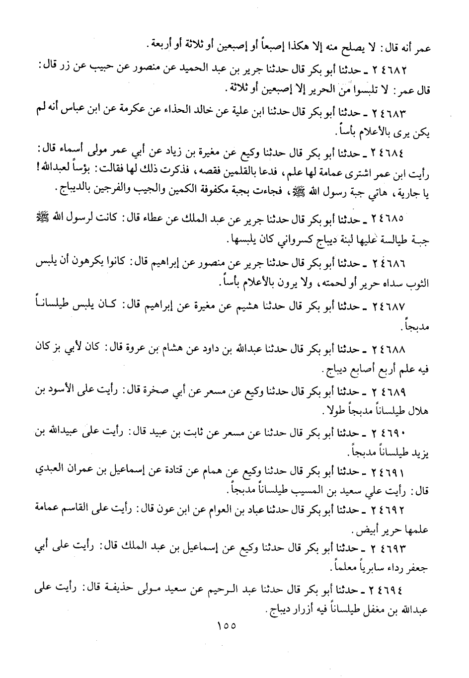 24682 - حَدَّثَنَا أَبُو بَكْرٍ قَالَ: حَدَّثَنَا جَرِيرُ بْنُ عَبْدِ الْحَمِيدِ، عَنْ مَنْصُورٍ، عَنْ حَبِيبٍ، عَنْ زِرٍّ، قَالَ: قَالَ عُمَرُ: «§لَا تَلْبَسُوا مِنَ الْحَرِيرِ إِلَّا أُصْبُعَيْنِ أَوْ ثَلَاثَةً»