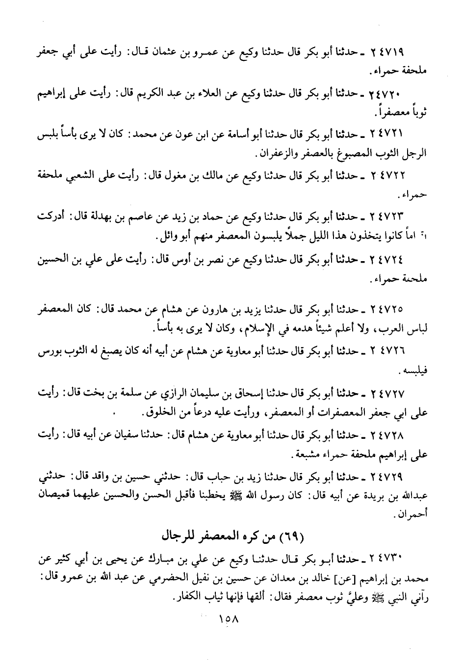 24720 - حَدَّثَنَا أَبُو بَكْرٍ قَالَ: حَدَّثَنَا وَكِيعٌ، عَنِ الْعَلَاءِ بْنِ عَبْدِ الْكَرِيمِ، قَالَ: «رَأَيْتُ عَلَى إِبْرَاهِيمَ §ثَوْبًا مُعَصْفَرًا»