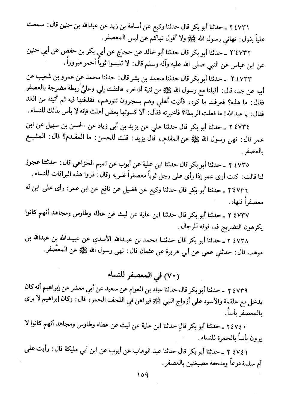 24738 - حَدَّثَنَا أَبُو بَكْرٍ قَالَ: حَدَّثَنَا مُحَمَّدُ بْنُ عَبْدِ اللَّهِ الْأَسَدِيُّ، عَنْ عُبَيْدِ اللَّهِ بْنِ عَبْدِ اللَّهِ بْنِ مَوْهَبٍ، قَالَ: حَدَّثَنِي عَمِّي، عَنْ أَبِي هُرَيْرَةَ، عَنْ عُثْمَانَ، قَالَ: «§نَهَى رَسُولُ اللَّهِ صَلَّى اللهُ عَلَيْهِ وَسَلَّمَ، عَنِ الْمُعَصْفَرِ»