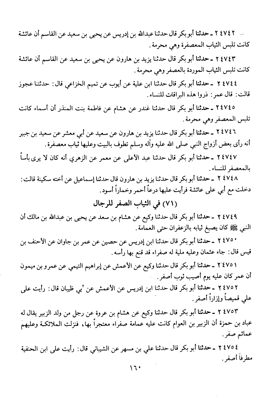 24742 - حَدَّثَنَا أَبُو بَكْرٍ قَالَ: قَالَ ابْنُ إِدْرِيسَ، عَنْ يَحْيَى بْنِ سَعِيدٍ، عَنِ الْقَاسِمِ: «أَنَّ عَائِشَةَ، كَانَتْ §تَلْبَسُ الثِّيَابَ الْمُعَصْفَرَةَ، وَهِيَ مُحْرِمَةٌ»