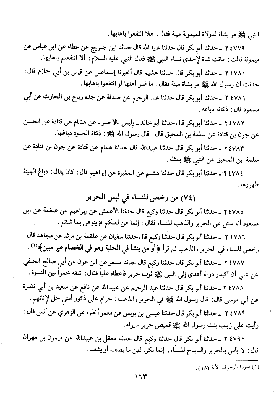 24786 - حَدَّثَنَا أَبُو بَكْرٍ قَالَ: حَدَّثَنَا وَكِيعٌ، قَالَ: حَدَّثَنَا سُفْيَانُ، عَنْ عَلْقَمَةَ بْنِ مَرْثَدٍ، عَنْ مُجَاهِدٍ، قَالَ: " §رُخِّصَ لِلنِّسَاءِ فِي الْحَرِيرِ، وَالذَّهَبِ ثُمَّ قَرَأَ: {أَوَمَنْ يُنَشَّأُ فِي الْحِلْيَةِ وَهُوَ فِي الْخِصَامِ غَيْرُ مُبِينٍ} [الزخرف: 18] "