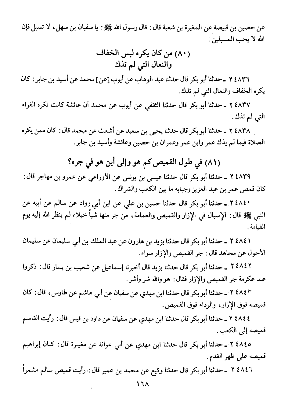 24845 - حَدَّثَنَا أَبُو بَكْرٍ قَالَ: حَدَّثَنَا ابْنُ مَهْدِيٍّ، عَنْ أَبِي عَوَانَةَ، عَنْ مُغِيرَةَ، قَالَ: «كَانَ إِبْرَاهِيمُ §قَمِيصُهُ عَلَى ظَهْرِ الْقَدَمِ»