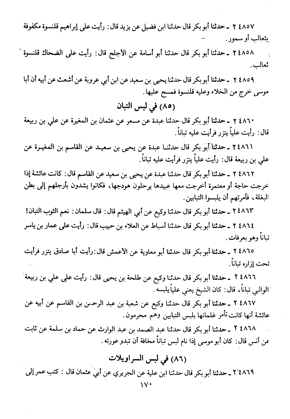 24866 - حَدَّثَنَا أَبُو بَكْرٍ قَالَ: حَدَّثَنَا وَكِيعٌ، عَنْ طَلْحَةَ بْنِ يَحْيَى، قَالَ: " رَأَيْتُ عَلَى عَلِيِّ بْنِ رَبِيعَةَ الْوَالِي §تُبَّانًا، قَالَ: «كَانَ الشَّيْخُ يَعْنِي عَلِيًّا يَلْبَسُهُ»
