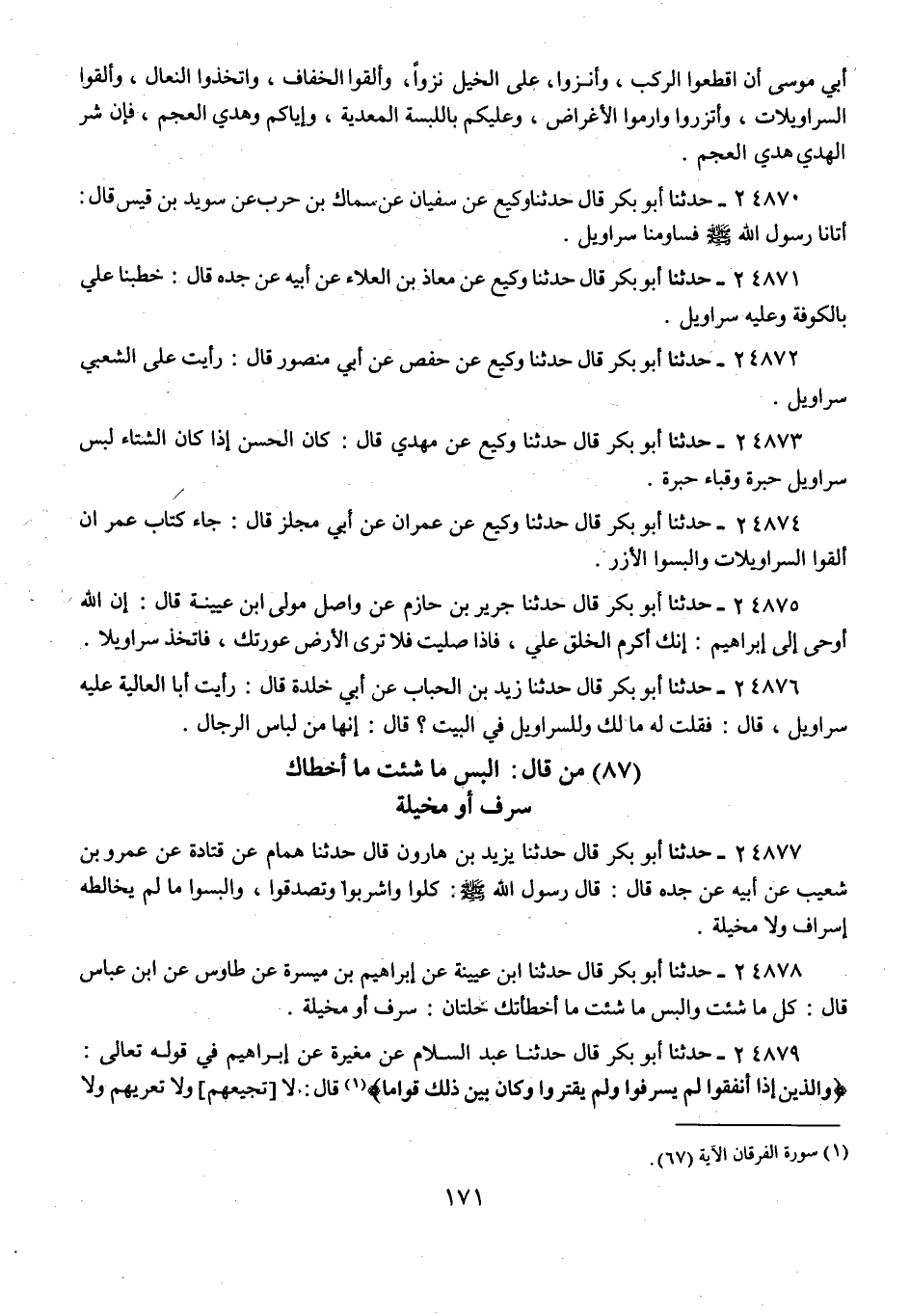 24872 - حَدَّثَنَا أَبُو بَكْرٍ قَالَ: حَدَّثَنَا وَكِيعٌ، عَنْ حَفْصٍ، عَنْ أَبِي مَنْصُورٍ، قَالَ: «رَأَيْتُ عَلَى الشَّعْبِيِّ §سَرَاوِيلَ»