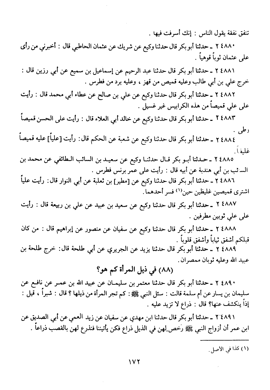 24886 - حَدَّثَنَا أَبُو بَكْرٍ قَالَ: حَدَّثَنَا وَكِيعٌ، عَنْ مَطَرِ بْنِ ثَعْلَبَةَ، عَنْ أَبِي النَّوَّارِ، قَالَ: «§رَأَيْتُ عَلِيًّا اشْتَرَى قَمِيصَيْنِ غَلِيظَيْنِ، حِينَ قَصَّرَ أَحَدَهُمَا»