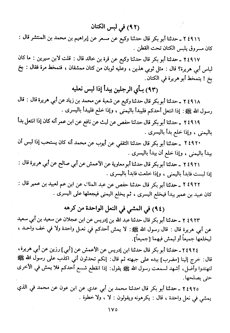 24920 - حَدَّثَنَا أَبُو بَكْرٍ قَالَ: حَدَّثَنَا الثَّقَفِيُّ، عَنْ أَيُّوبَ، عَنْ مُحَمَّدٍ: «أَنَّهُ كَانَ §يَسْتَحِبُّ إِذَا لَبِسَ أَنْ يَبْدَأَ بِالْيُمْنَى، وَإِذَا خَلَعَ أَنْ يَبْدَأَ بِالْيُسْرَى»