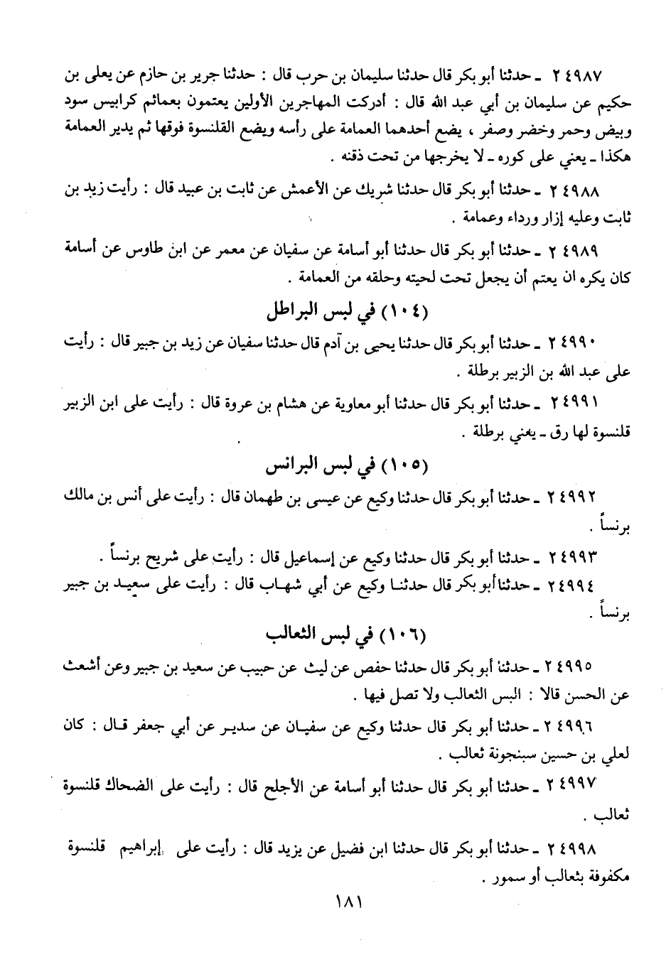 24987 - حَدَّثَنَا أَبُو بَكْرٍ قَالَ: حَدَّثَنَا سُلَيْمَانُ بْنُ حَرْبٍ، قَالَ: حَدَّثَنَا جَرِيرُ بْنُ حَازِمٍ، عَنْ يَعْلَى بْنِ حَكِيمٍ، عَنْ سُلَيْمَانَ بْنِ أَبِي عَبْدِ اللَّهِ، قَالَ: " §أَدْرَكْتُ الْمُهَاجِرِينَ الْأَوَّلِينَ يَعْتَمُّونَ بِعَمَائِمَ كَرَابِيسَ سُودٍ، وَبِيضٍ، وَحُمْرٍ، وَخُضْرٍ، وَصُفْرٍ، يَضَعُ أَحَدُهُمَا الْعِمَامَةَ عَلَى رَأْسِهِ، وَيَضَعُ الْقَلَنْسُوَةَ فَوْقَهَا، ثُمَّ يُدِيرُ الْعِمَامَةَ هَكَذَا , يَعْنِي: عَلَى كَوْرِهِ لَا يُخْرِجُهَا مِنْ تَحْتِ ذَقَنِهِ "