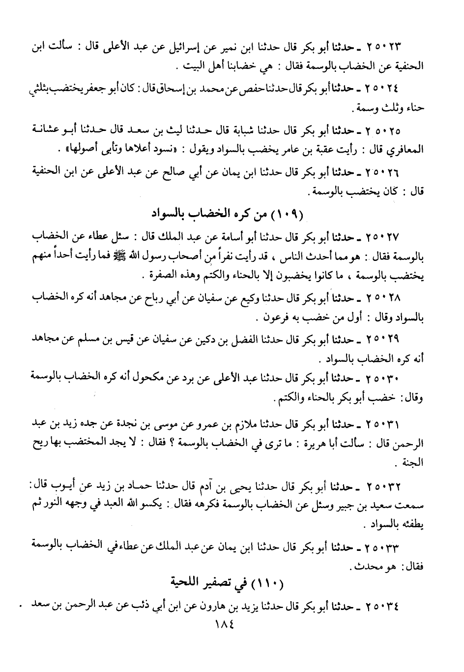 25026 - حَدَّثَنَا أَبُو بَكْرٍ قَالَ: حَدَّثَنَا ابْنُ يَمَانٍ، عَنْ أَبِي صَالِحٍ، عَنْ عَبْدِ الْأَعْلَى، عَنِ ابْنِ الْحَنَفِيَّةِ، قَالَ: «كَانَ §يَخْتَضِبُ بِالْوَسْمَةِ»