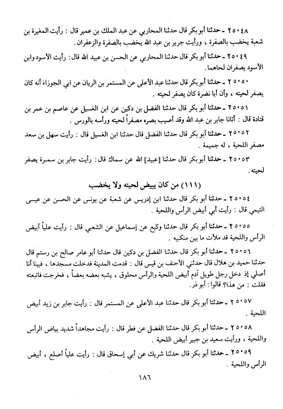 25059 - حَدَّثَنَا أَبُو بَكْرٍ قَالَ: حَدَّثَنَا شَرِيكٌ، عَنْ أَبِي إِسْحَاقَ، قَالَ: «§رَأَيْتُ عَلِيًّا أَصْلَعَ، أَبْيَضَ الرَّأْسِ وَاللِّحْيَةِ»