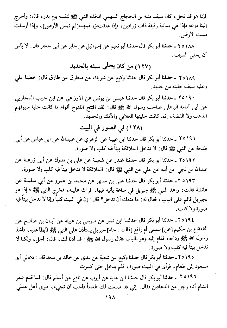 25191 - حَدَّثَنَا أَبُو بَكْرٍ قَالَ: حَدَّثَنَا ابْنُ عُيَيْنَةَ، عَنِ الزُّهْرِيِّ، عَنْ عُبَيْدِ اللَّهِ، عَنِ ابْنِ عَبَّاسٍ، عَنْ أَبِي طَلْحَةَ، عَنِ النَّبِيِّ صَلَّى اللهُ عَلَيْهِ وَسَلَّمَ، قَالَ: «§لَا تَدْخُلُ الْمَلَائِكَةُ بَيْتًا فِيهِ كَلْبٌ، وَلَا صُورَةٌ»