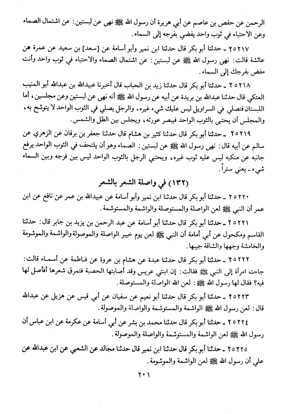25220 - حَدَّثَنَا أَبُو بَكْرٍ قَالَ: حَدَّثَنَا ابْنُ نُمَيْرٍ، وَأَبُو أُسَامَةَ، عَنْ عُبَيْدِ اللَّهِ بْنِ عُمَرَ، عَنْ نَافِعٍ، عَنِ ابْنِ عُمَرَ، أَنَّ النَّبِيَّ صَلَّى اللهُ عَلَيْهِ وَسَلَّمَ: «§لَعَنَ الْوَاصِلَةَ، وَالْمُسْتَوْصِلَةَ، وَالْوَاشِمَةَ، وَالْمُسْتَوْشِمَةَ»