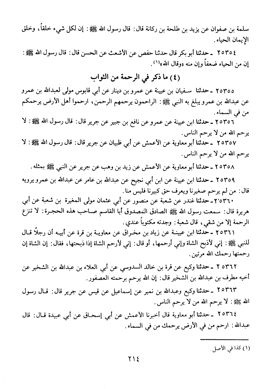 25357 - حَدَّثَنَا أَبُو مُعَاوِيَةَ، عَنِ الْأَعْمَشِ، عَنْ أَبِي ظَبْيَانَ، عَنْ جَرِيرٍ، قَالَ: قَالَ رَسُولُ اللَّهِ صَلَّى اللهُ عَلَيْهِ وَسَلَّمَ: «§لَا يَرْحَمُ اللَّهُ مَنْ لَا يَرْحَمُ النَّاسَ»