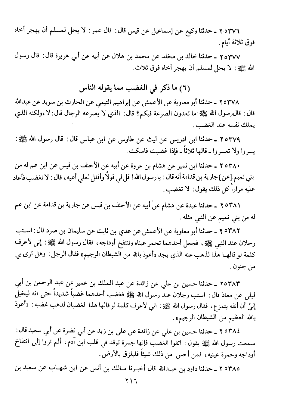 25382 - حَدَّثَنَا أَبُو مُعَاوِيَةَ، عَنِ الْأَعْمَشِ، عَنْ عَدِيِّ بْنِ ثَابِتٍ، عَنْ سُلَيْمَانَ بْنِ صُرَدٍ، قَالَ: اسْتَبَّ رَجُلَانِ عِنْدَ النَّبِيِّ صَلَّى اللهُ عَلَيْهِ وَسَلَّمَ، فَجَعَلَ أَحَدُهُمَا تَحْمَرُّ عَيْنَاهُ، وَتَنْتَفِخُ أَوْدَاجُهُ، فَقَالَ رَسُولُ اللَّهِ صَلَّى اللهُ عَلَيْهِ وَسَلَّمَ: " §إِنِّي لَأَعْرِفُ كَلِمَةً لَوْ قَالَهَا هَذَا لَذَهَبَ عَنْهُ الَّذِي يَجِدُ: أَعُوذُ بِاللَّهِ مِنَ الشَّيْطَانِ الرَّجِيمِ " فَقَالَ الرَّجُلُ: وَهَلْ تَرَى بِي مِنْ جُنُونٍ؟