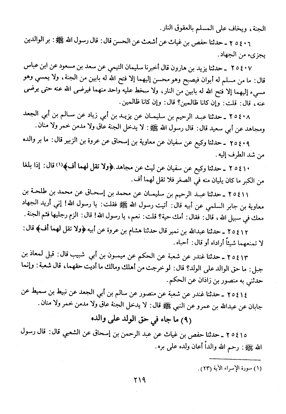 25411 - حَدَّثَنَا عَبْدُ الرَّحِيمِ بْنُ سُلَيْمَانَ، عَنْ مُحَمَّدِ بْنِ إِسْحَاقَ، عَنْ مُحَمَّدِ بْنِ طَلْحَةَ بْنِ مُعَاوِيَةَ بْنِ جَابِرٍ السُّلَمِيِّ، عَنْ أَبِيهِ، قَالَ: أَتَيْتُ رَسُولَ اللَّهِ صَلَّى اللهُ عَلَيْهِ وَسَلَّمَ، فَقُلْتُ: يَا رَسُولَ اللَّهِ، إِنِّي أُرِيدُ الْجِهَادَ مَعَكَ فِي سَبِيلِ اللَّهِ، قَالَ: فَقَالَ: «أُمُّكَ حَيَّةٌ؟» قُلْتُ: نَعَمْ، يَا رَسُولَ اللَّهِ، قَالَ: «§الْزَمْ رِجْلَيْهَا فَثَمَّ الْجَنَّةُ»