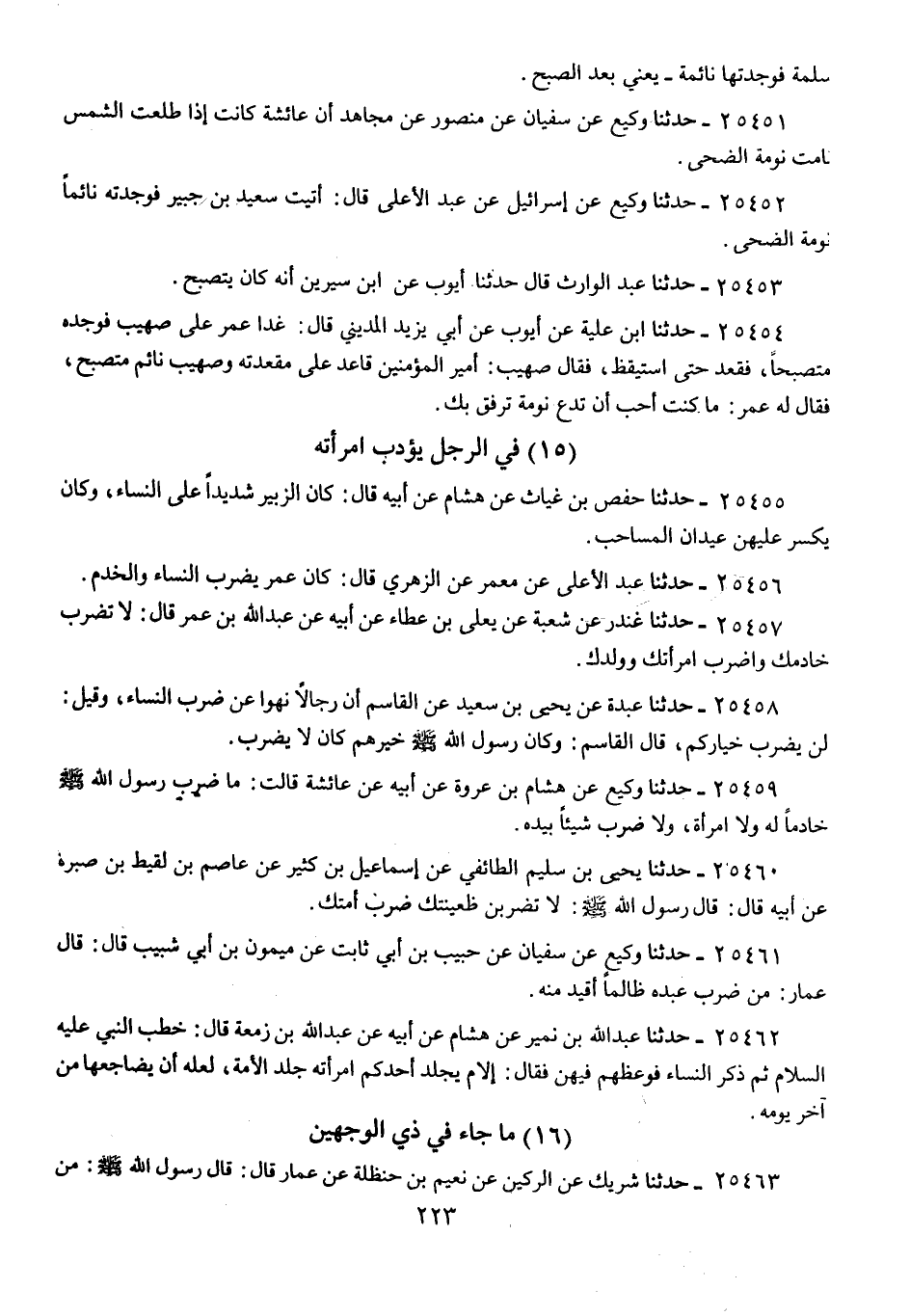 25455 - حَدَّثَنَا حَفْصُ بْنُ غِيَاثٍ، عَنْ هِشَامٍ، عَنْ أَبِيهِ، قَالَ: «كَانَ §الزُّبَيْرُ شَدِيدًا عَلَى النِّسَاءِ، وَكَانَ يُكَسِّرُ عَلَيْهِنَّ عِيدَانَ الْمَسَاحِبِ»