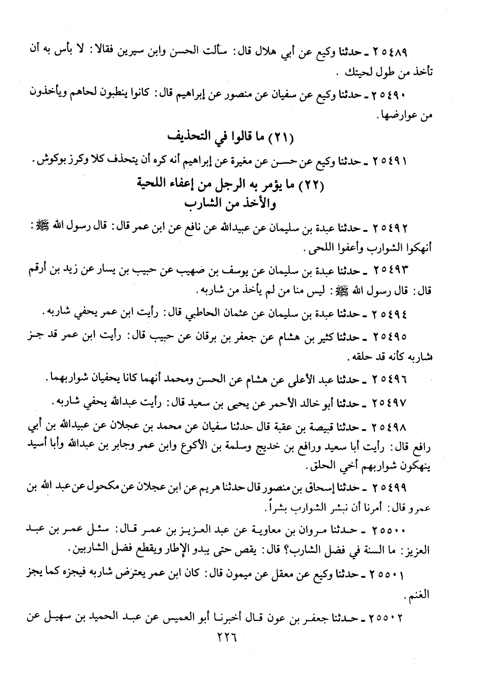 25492 - حَدَّثَنَا عَبْدَةُ بْنُ سُلَيْمَانَ، عَنْ عُبَيْدِ اللَّهِ، عَنْ نَافِعٍ، عَنِ ابْنِ عُمَرَ، قَالَ: قَالَ رَسُولُ اللَّهِ صَلَّى اللهُ عَلَيْهِ وَسَلَّمَ: «§انْهَكُوا الشَّوَارِبَ، وَاعْفُوا اللِّحَى»