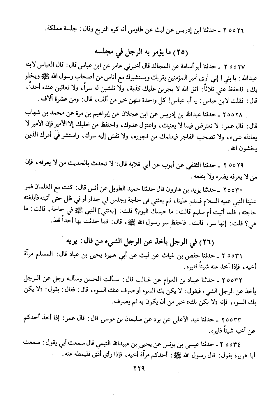 25527 - حَدَّثَنَا أَبُو أُسَامَةَ، عَنِ الْمُجَالِدِ، قَالَ: أَخْبَرَنِي عَامِرٌ، عَنِ ابْنِ عَبَّاسٍ، قَالَ: قَالَ الْعَبَّاسُ لِابْنِهِ عَبْدِ اللَّهِ: يَا بُنَيَّ، إِنِّي أَرَى أَمِيرَ الْمُؤْمِنِينَ يُقَرِّبُكَ، وَيَسْتَشِيرُكَ مَعَ أُنَاسٍ مِنْ أَصْحَابِ رَسُولِ اللَّهِ صَلَّى اللهُ عَلَيْهِ وَسَلَّمَ , وَيَخْلُو بِكَ، فَاحْفَظْ عَنِّي ثَلَاثًا: «§اتَّقِ اللَّهَ , لَا يُجَرِّبَنَّ عَلَيْكَ كِذْبَةً، وَلَا تُفْشِيَنَّ لَهُ سِرًّا، وَلَا تُعَاتِبَنَّ عِنْدَهُ أَحَدًا» قَالَ: فَقُلْتُ لِابْنِ عَبَّاسٍ: يَا أَبَا عَبَّاسٍ، كُلُّ وَاحِدَةٍ مِنْهُنَّ خَيْرٌ مِنْ أَلْفٍ، قَالَ: وَمِنْ عَشَرَةِ آلَافٍ