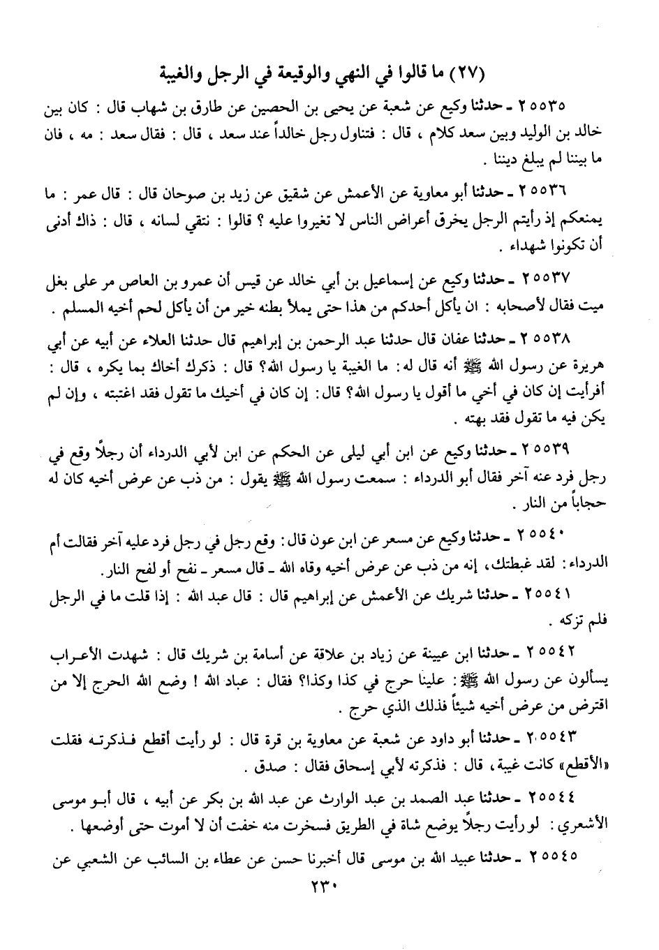 25539 - حَدَّثَنَا وَكِيعٌ، عَنِ ابْنِ أَبِي لَيْلَى، عَنِ الْحَكَمِ، عَنِ ابْنٍ لِأَبِي الدَّرْدَاءِ، أَنَّ رَجُلًا، وَقَعَ فِي رَجُلٍ فَرَدَّ عَنْهُ آخَرُ، فَقَالَ أَبُو الدَّرْدَاءِ: سَمِعْتُ رَسُولَ اللَّهِ صَلَّى اللهُ عَلَيْهِ وَسَلَّمَ يَقُولُ: «§مَنْ ذَبَّ عَنْ عِرْضِ أَخِيهِ كَانَ لَهُ حِجَابًا مِنَ النَّارِ»