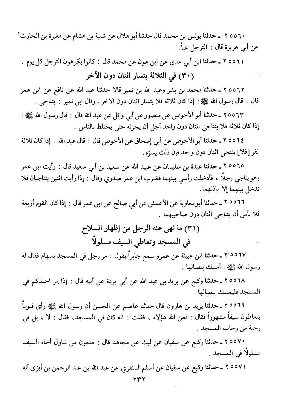 25564 - حَدَّثَنَا أَبُو الْأَحْوَصِ، عَنْ أَبِي إِسْحَاقَ، عَنِ الْأَحْوَصِ، قَالَ: قَالَ عَبْدُ اللَّهِ: «إِذَا كَانَ §ثَلَاثَةُ نَفَرٍ يَنْتَجِي اثْنَانِ دُونَ وَاحِدٍ فَإِنَّ ذَلِكَ يَسُوءُهُ»