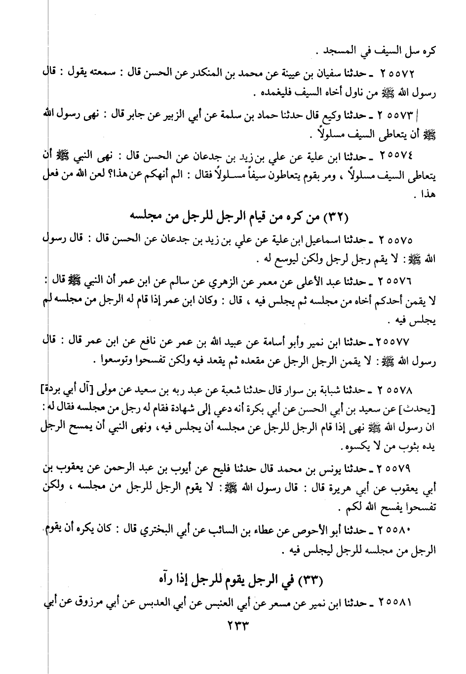 25575 - حَدَّثَنَا إِسْمَاعِيلُ ابْنُ عُلَيَّةَ، عَنْ عَلِيِّ بْنِ زَيْدِ بْنِ جُدْعَانَ، عَنِ الْحَسَنِ، قَالَ: قَالَ رَسُولُ اللَّهِ صَلَّى اللهُ عَلَيْهِ وَسَلَّمَ: «§لَا يَقُمْ رَجُلٌ لِرَجُلٍ، وَلَكِنْ لِيُوسِعْ لَهُ»