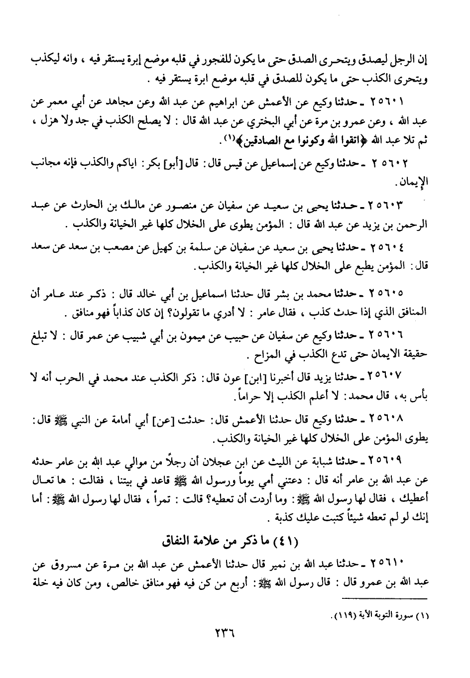 25605 - حَدَّثَنَا مُحَمَّدُ بْنُ بِشْرٍ قَالَ: حَدَّثَنَا إِسْمَاعِيلُ بْنُ أَبِي خَالِدٍ، قَالَ: ذُكِرَ عِنْدَ عَامِرٍ أَنَّ الْمُنَافِقَ الَّذِي إِذَا حَدَّثَ كَذَبَ، فَقَالَ عَامِرٌ: «§لَا أَدْرِي مَا تَقُولُونَ؟ إِنْ كَانَ كَذَّابًا فَهُوَ مُنَافِقٌ»