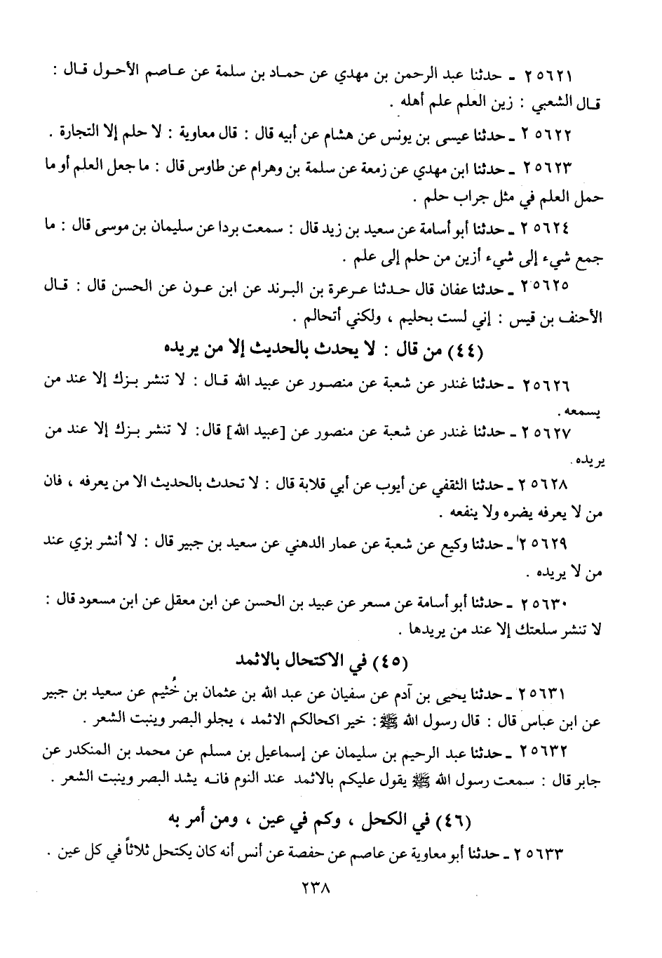 25621 - حَدَّثَنَا عَبْدُ اللَّهِ بْنُ مَهْدِيٍّ، عَنْ حَمَّادِ بْنِ سَلَمَةَ، عَنْ عَاصِمٍ الْأَحْوَلِ، قَالَ: قَالَ الشَّعْبِيُّ: «§زَيْنُ الْعِلْمِ حِلْمُ أَهْلِهِ»