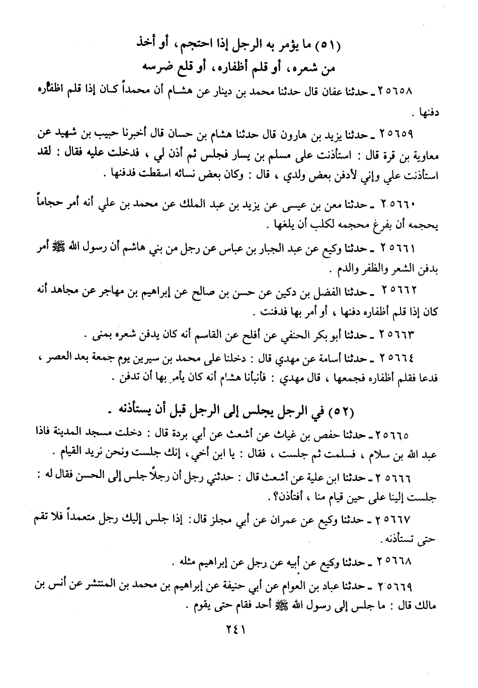 25661 - حَدَّثَنَا وَكِيعٌ، عَنْ عَبْدِ الْجَبَّارِ بْنِ عَبَّاسٍ، عَنْ رَجُلٍ، مِنْ بَنِي هَاشِمٍ أَنَّ رَسُولَ اللَّهِ صَلَّى اللهُ عَلَيْهِ وَسَلَّمَ: «§أَمَرَ بِدَفْنِ الشَّعْرِ، وَالظُّفُرِ، وَالدَّمِ»