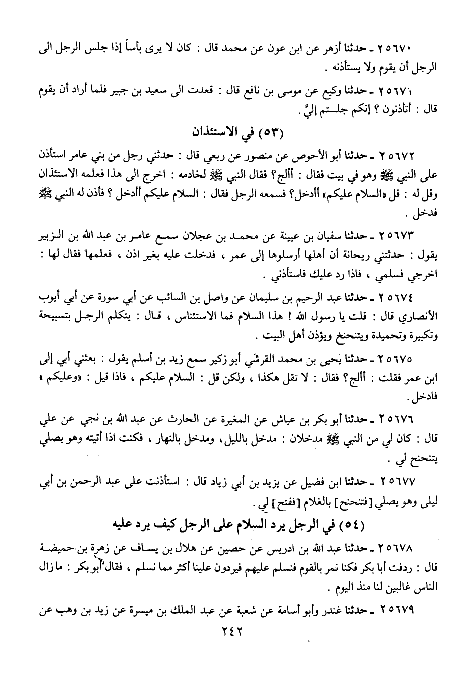 25672 - حَدَّثَنَا أَبُو الْأَحْوَصِ، عَنْ مَنْصُورٍ، عَنْ رِبْعِيٍّ، قَالَ: حَدَّثَنِي رَجُلٌ مِنْ بَنِي عَامِرٍ اسْتَأْذَنَ عَلَى النَّبِيِّ صَلَّى اللهُ عَلَيْهِ وَسَلَّمَ، وَهُوَ فِي بَيْتٍ فَقَالَ: أَأَلِجُ؟ فَقَالَ النَّبِيُّ صَلَّى اللهُ عَلَيْهِ وَسَلَّمَ لِخَادِمِهِ: " §اخْرُجْ إِلَى هَذَا فَعَلِّمْهُ الِاسْتِئْذَانَ، وَقُلْ لَهُ: قُلِ السَّلَامُ عَلَيْكُمْ , أَأَدْخُلُ؟ " فَسَمِعَهُ الرَّجُلُ فَقَالَ: السَّلَامُ عَلَيْكُمْ , أَأَدْخُلُ؟ فَأَذِنَ لَهُ النَّبِيُّ صَلَّى اللهُ عَلَيْهِ وَسَلَّمَ , فَدَخَلَ "