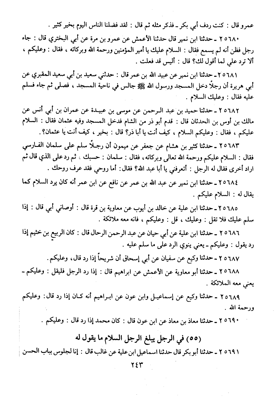 25684 - حَدَّثَنَا ابْنُ نُمَيْرٍ، عَنْ عَبْدِ اللَّهِ بْنِ عُمَرَ، عَنْ نَافِعٍ، عَنِ ابْنِ عُمَرَ: " أَنَّهُ كَانَ §يَرُدُّ السَّلَامَ كَمَا يُقَالُ لَهُ: السَّلَامُ عَلَيْكُمْ "