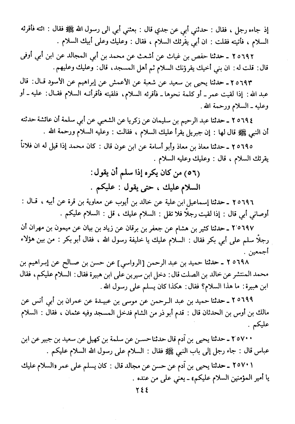25698 - حَدَّثَنَا حُمَيْدُ بْنُ عَبْدِ الرَّحْمَنِ الرُّؤَاسِيُّ , عَنْ حَسَنِ بْنِ صَالِحٍ , عَنْ إِبْرَاهِيمَ بْنِ مُحَمَّدِ بْنِ الْمُنْتَشِرِ , عَنْ خَالِدِ بْنِ أَبِي الصَّلْتِ , قَالَ: دَخَلَ ابْنُ سِيرِينَ عَلَى ابْنِ هُبَيْرَةَ , فَقَالَ: السَّلَامُ عَلَيْكُمْ , فَقَالَ ابْنُ هُبَيْرَةَ: مَا هَذَا السَّلَامُ؟ فَقَالَ: «§هَكَذَا كَانَ يُسَلَّمُ عَلَى رَسُولِ اللَّهِ»