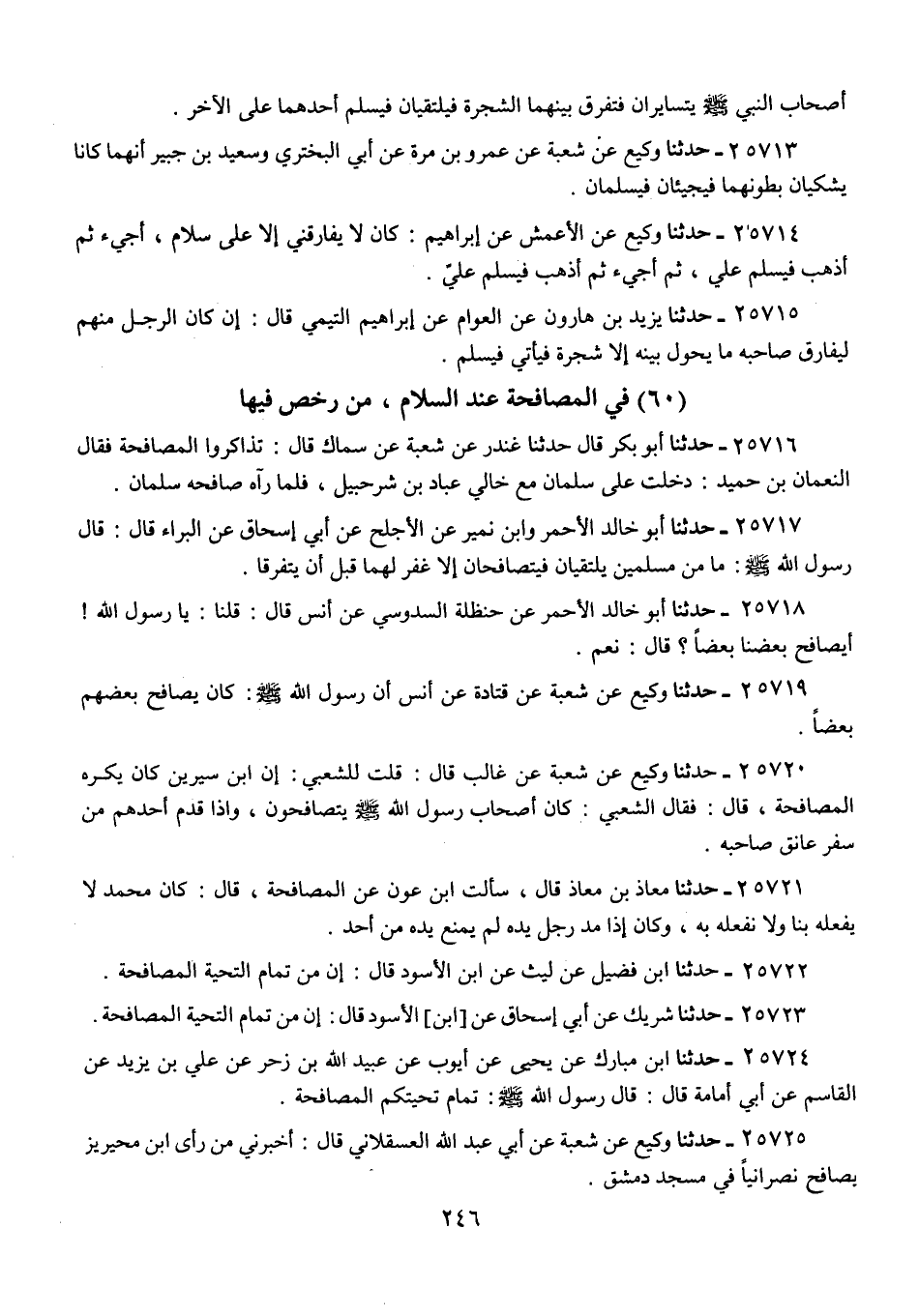 25720 - حَدَّثَنَا وَكِيعٌ، عَنْ شُعْبَةَ، عَنْ غَالِبٍ، قَالَ: قُلْتُ لِلشَّعْبِيِّ: إِنَّ ابْنَ سِيرِينَ كَانَ يَكْرَهُ الْمُصَافَحَةَ، قَالَ: فَقَالَ الشَّعْبِيُّ: كَانَ أَصْحَابُ رَسُولِ اللَّهِ صَلَّى اللهُ عَلَيْهِ وَسَلَّمَ: §يَتَصَافَحُونَ، وَإِذَا قَدِمَ أَحَدُهُمْ مِنْ سَفَرٍ عَانَقَ صَاحِبَهُ "