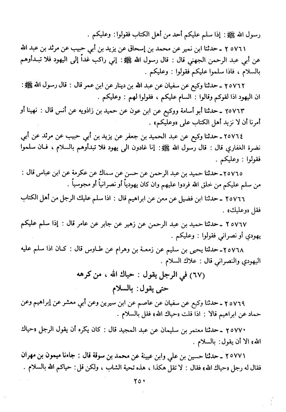 25771 - حَدَّثَنَا حُسَيْنُ بْنُ عَلِيٍّ، وَابْنُ عُيَيْنَةَ، عَنْ مُحَمَّدِ بْنِ سُوقَةَ، قَالَ: جَاءَنَا مَيْمُونُ بْنُ مِهْرَانَ فَقَالَ لَهُ رَجُلٌ: حَيَّاكَ اللَّهُ، فَقَالَ: " §لَا تَقُلْ هَكَذَا، هَذِهِ تَحِيَّةُ الشَّابِّ، وَلَكِنْ قُلْ: حَيَّاكُمُ اللَّهُ بِالسَّلَامِ