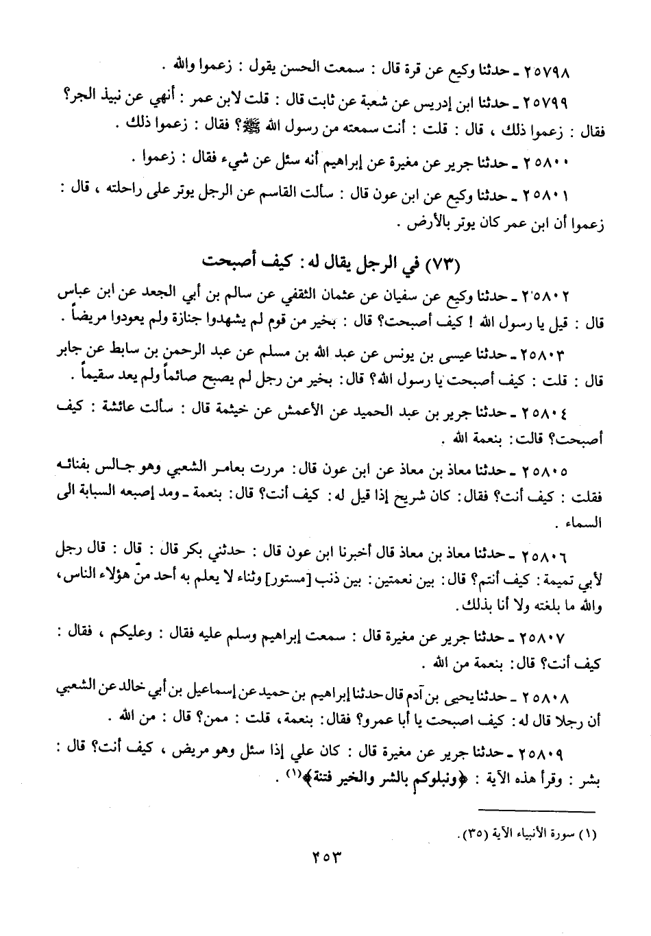 25809 - حَدَّثَنَا جَرِيرٌ، عَنْ مُغِيرَةَ، قَالَ: كَانَ عَلِيٌّ إِذَا سُئِلَ وَهُوَ مَرِيضٌ: كَيْفَ أَنْتَ؟ قَالَ: " §بِشَرٍّ: وَقَرَأَ هَذِهِ الْآيَةَ: {وَنَبْلُوكُمْ بِالشَّرِّ وَالْخَيْرِ فِتْنَةً} [الأنبياء: 35] "