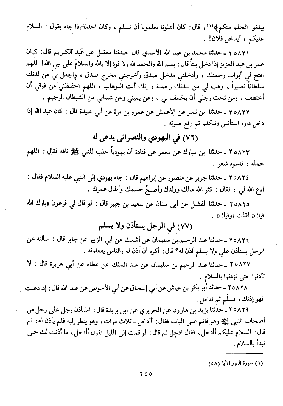 25827 - حَدَّثَنَا عَبْدُ الرَّحِيمِ بْنُ سُلَيْمَانَ، عَنْ عَبْدِ الْمَلِكِ، عَنْ عَطَاءٍ، عَنْ أَبِي هُرَيْرَةَ، قَالَ: «§لَا تَأْذَنُوا حَتَّى تُؤْذَنُوا بِالسَّلَامِ»