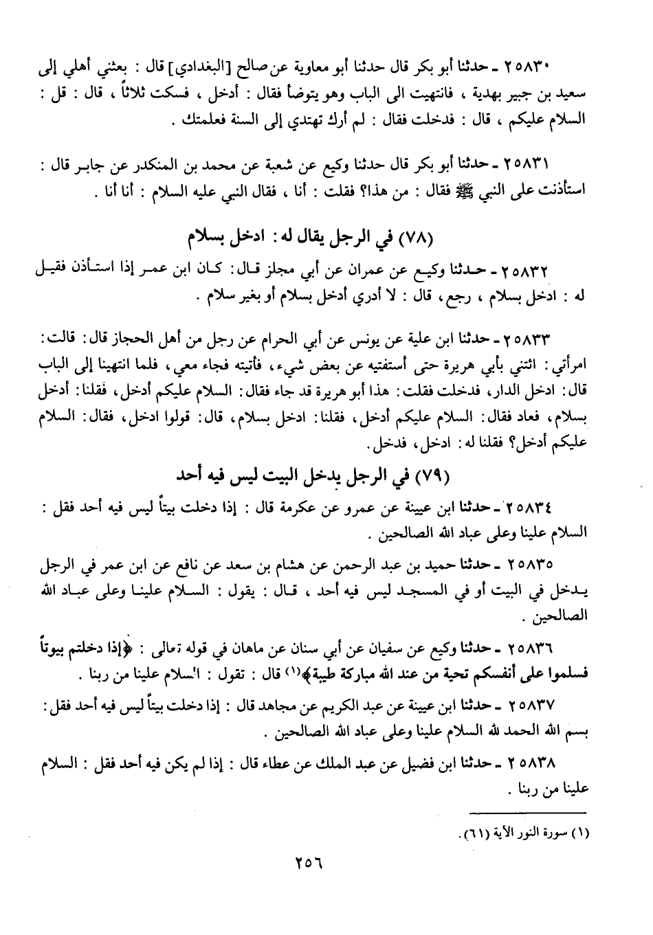 25830 - حَدَّثَنَا أَبُو بَكْرٍ قَالَ: حَدَّثَنَا أَبُو مُعَاوِيَةَ، عَنْ صَالِحٍ الْعَدَوِيِّ، قَالَ: بَعَثَنِي أَهْلِي إِلَى سَعِيدِ بْنِ جُبَيْرٍ بِهَدِيَّةٍ، فَانْتَهَيْتُ إِلَى الْبَابِ وَهُوَ يَتَوَضَّأُ فَقُلْتُ: أَدْخُلُ؟ فَسَكَتَ , ثَلَاثًا، قَالَ: قُلِ: السَّلَامُ عَلَيْكُمْ، قَالَ: فَدَخَلْتُ، فَقَالَ: «§لَمْ أَرَكَ تَهْتَدِي إِلَى السُّنَّةِ فَعَلَّمْتُكَ»