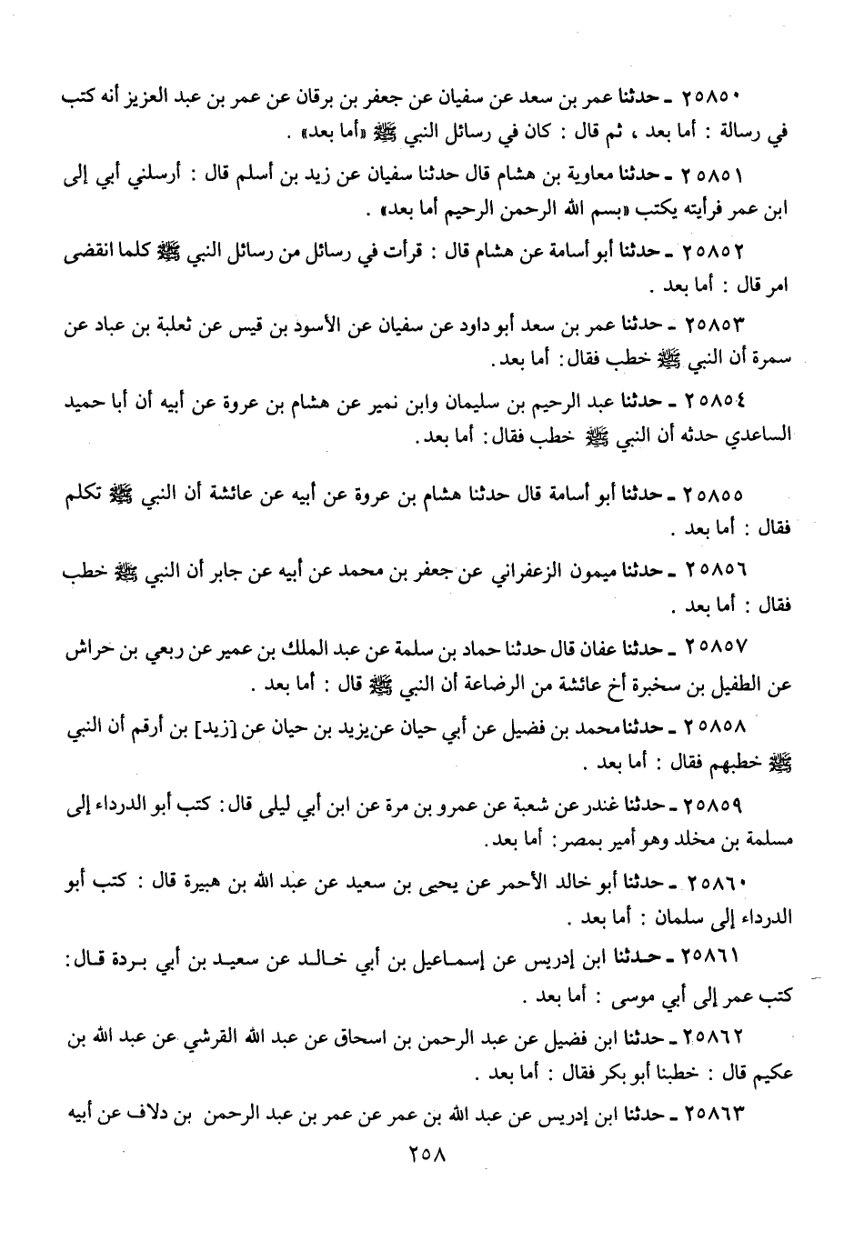 25852 - حَدَّثَنَا أَبُو أُسَامَةَ، عَنْ هِشَامٍ، قَالَ: " §قَرَأْتُ فِي رَسَائِلَ مِنْ رَسَائِلِ النَّبِيِّ صَلَّى اللهُ عَلَيْهِ وَسَلَّمَ، كُلَّمَا انْقَضَى أَمْرٌ , قَالَ: أَمَّا بَعْدُ "