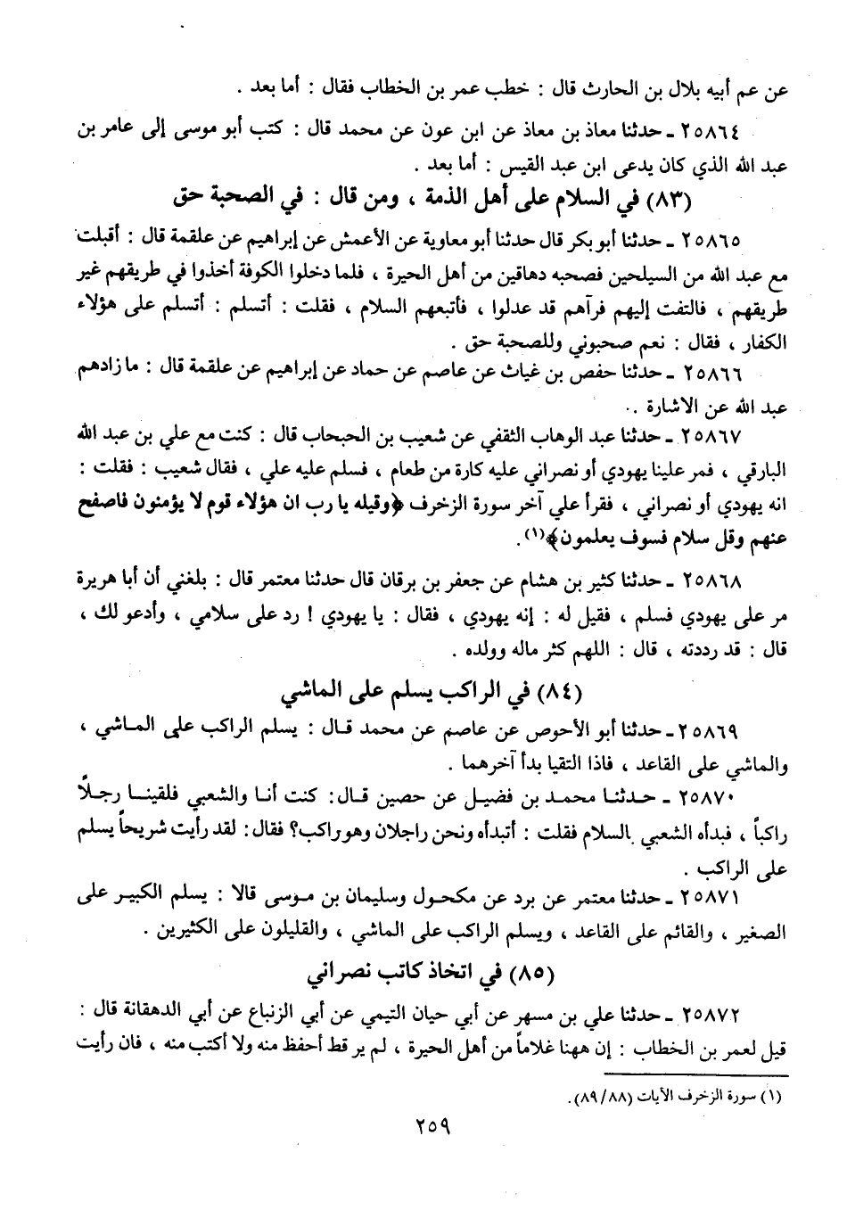 25867 - حَدَّثَنَا عَبْدُ الْوَهَّابِ الثَّقَفِيُّ، عَنْ شُعَيْبِ بْنِ الْحَبْحَابِ، قَالَ: كُنْتُ مَعَ عَلِيِّ بْنِ عَبْدِ اللَّهِ الْبَارِقِيِّ، فَمَرَّ عَلَيْنَا يَهُودِيٌّ أَوْ نَصْرَانِيٌّ عَلَيْهِ كَارَةٌ مِنْ طَعَامٍ، فَسَلَّمَ عَلَيْهِ عَلِيٌّ، فَقَالَ شُعَيْبٌ: فَقُلْتُ: إِنَّهُ يَهُودِيٌّ أَوْ نَصْرَانِيٌّ فَقَرَأَ عَلِيٌّ آخِرَ سُورَةِ الزُّخْرُفِ: {§وَقِيلِهِ يَا رَبِّ إِنَّ هَؤُلَاءِ قَوْمٌ لَا يُؤْمِنُونَ فَاصْفَحْ عَنْهُمْ وَقُلْ سَلَامٌ فَسَوْفَ يَعْلَمُونَ}