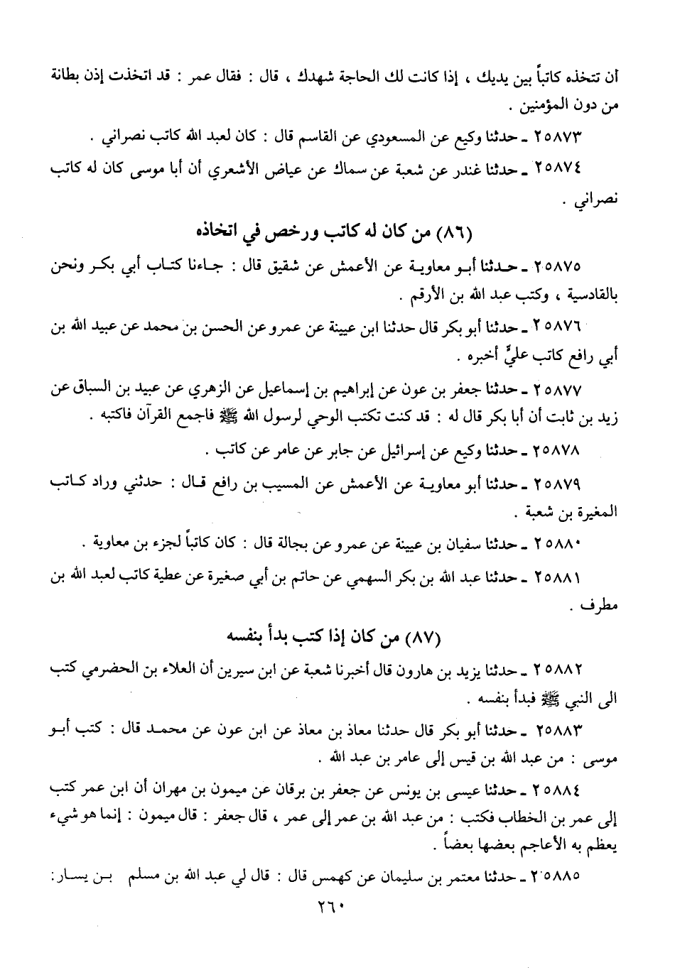 25873 - حَدَّثَنَا وَكِيعٌ، عَنِ الْمَسْعُودِيِّ، عَنِ الْقَاسِمِ، قَالَ: «كَانَ §لِعَبْدِ اللَّهِ كَاتِبٌ نَصْرَانِيٌّ»