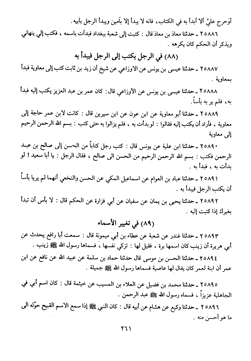 25886 - حَدَّثَنَا مُعَاذُ بْنُ مُعَاذٍ، قَالَ: «§كَتَبْتُ إِلَى شُعْبَةَ بِبَغْدَادَ فَبَدَأْتُ بِاسْمِهِ، فَكَتَبَ إِلَيَّ يَنْهَانِي، وَيَذْكُرُ أَنَّ الْحَكَمَ كَانَ يَكْرَهُهُ»