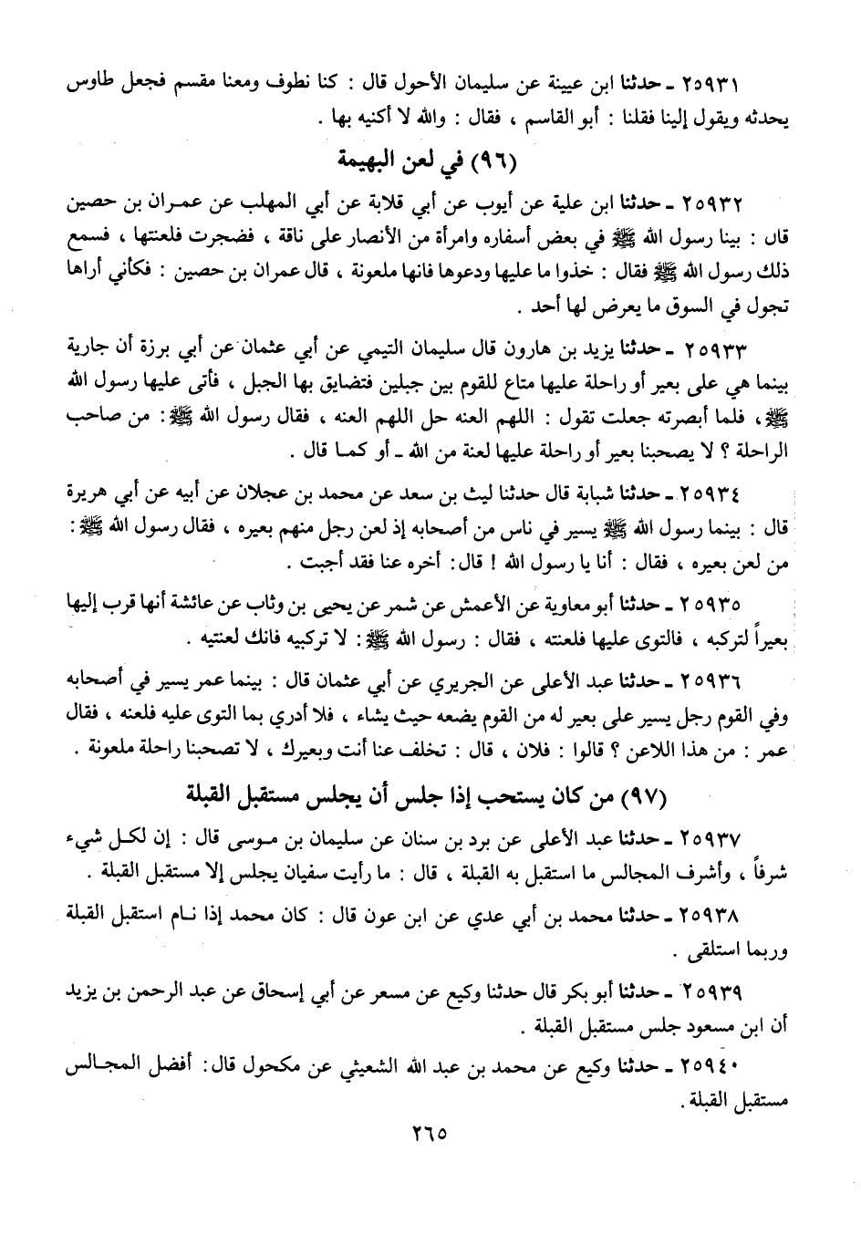 25934 - حَدَّثَنَا شَبَابَةُ، قَالَ: حَدَّثَنَا لَيْثُ بْنُ سَعْدٍ، عَنْ مُحَمَّدِ بْنِ عَجْلَانَ، عَنْ أَبِيهِ، عَنْ أَبِي هُرَيْرَةَ، قَالَ: بَيْنَمَا رَسُولُ اللَّهِ صَلَّى اللهُ عَلَيْهِ وَسَلَّمَ يَسِيرُ فِي نَاسٍ مِنْ أَصْحَابِهِ، إِذْ لَعَنَ رَجُلٌ مِنْهُمْ بَعِيرَهُ، فَقَالَ رَسُولُ اللَّهِ صَلَّى اللهُ عَلَيْهِ وَسَلَّمَ: «§مَنْ لَعَنَ بَعِيرَهُ»؟ فَقَالَ: أَنَا يَا رَسُولَ اللَّهِ، قَالَ: «أَخِّرْهُ عَنَّا فَقَدْ أُجِبْتَ»