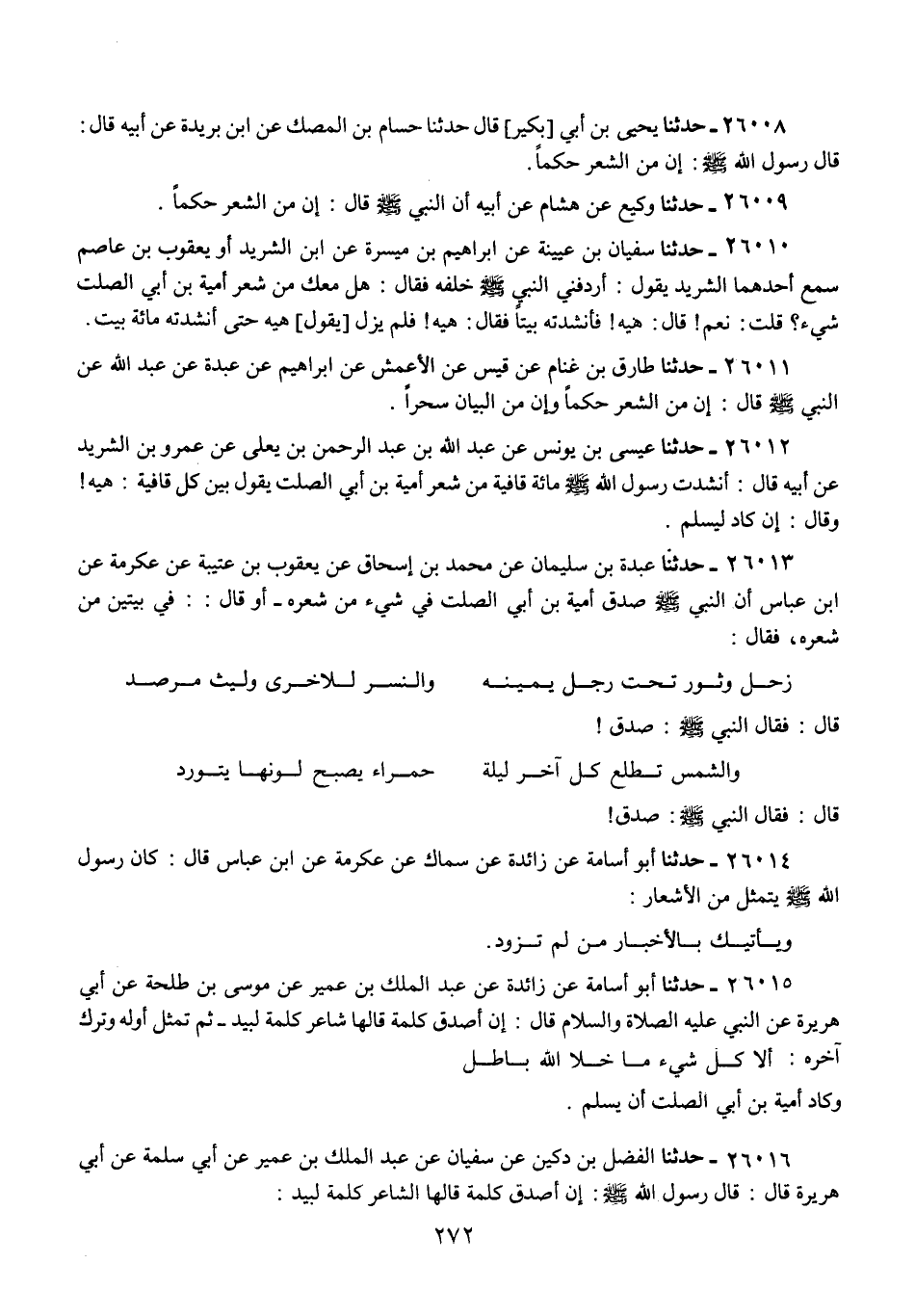 26012 - حَدَّثَنَا عِيسَى بْنُ يُونُسَ، عَنْ عَبْدِ اللَّهِ بْنِ عَبْدِ الرَّحْمَنِ بْنِ يَعْلَى، عَنْ عَمْرِو بْنِ الشَّرِيدِ، عَنْ أَبِيهِ، قَالَ: §أَنْشَدْتُ رَسُولَ اللَّهِ صَلَّى اللهُ عَلَيْهِ وَسَلَّمَ مِائَةَ قَافِيَةٍ مِنْ شِعْرِ أُمَيَّةَ بْنِ أَبِي الصَّلْتِ يَقُولُ بَيْنَ كُلِّ قَافِيَةٍ: «هِيهِ»، وَقَالَ: «إِنْ كَادَ لَيُسْلِمُ»