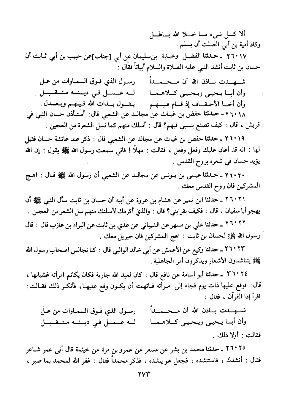 26022 - حَدَّثَنَا عَلِيُّ بْنُ مُسْهِرٍ، عَنِ الشَّيْبَانِيِّ، عَنْ عَدِيِّ بْنِ ثَابِتٍ، عَنِ الْبَرَاءِ بْنِ عَازِبٍ، قَالَ: قَالَ رَسُولُ اللَّهِ صَلَّى اللهُ عَلَيْهِ وَسَلَّمَ لِحَسَّانَ بْنِ ثَابِتٍ: «§اهْجُ الْمُشْرِكِينَ، فَإِنَّ جِبْرِيلَ مَعَكَ»