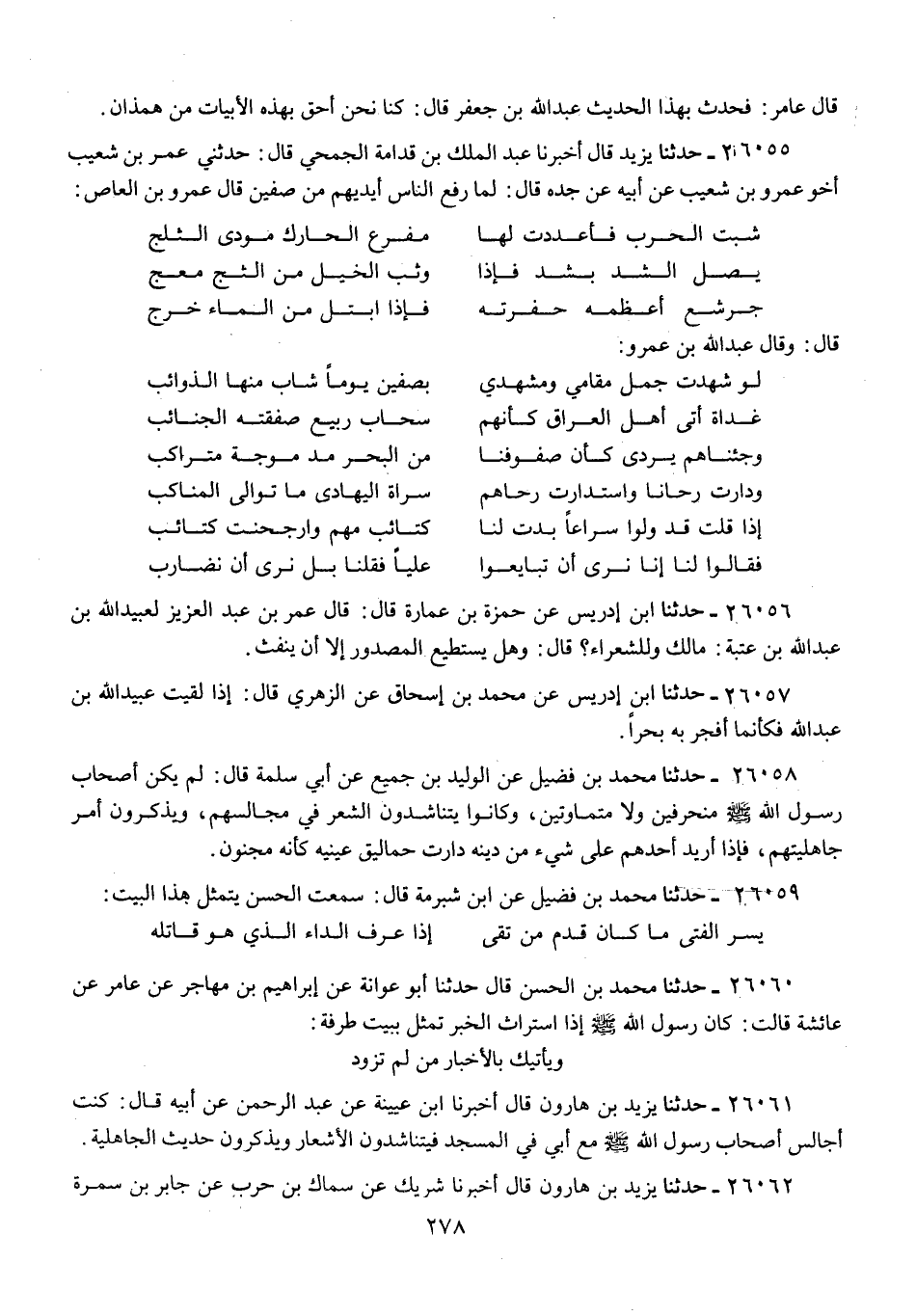 26061 - حَدَّثَنَا يَزِيدُ بْنُ هَارُونَ، قَالَ: أَخْبَرَنَا ابْنُ عُيَيْنَةَ، عَنْ عَبْدِ الرَّحْمَنِ، عَنْ أَبِيهِ، قَالَ: «كُنْتُ §أُجَالِسُ أَصْحَابَ رَسُولِ اللَّهِ صَلَّى اللهُ عَلَيْهِ وَسَلَّمَ مَعَ أَبِي فِي الْمَسْجِدِ فَيَتَنَاشَدُونَ الْأَشْعَارَ، وَيَذْكُرُونَ حَدِيثَ الْجَاهِلِيَّةِ»