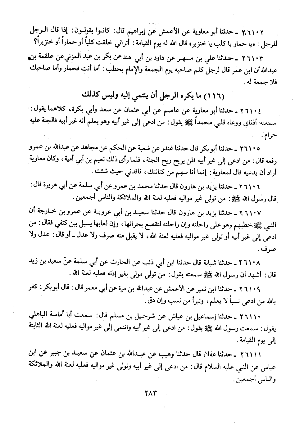 26110 - حَدَّثَنَا إِسْمَاعِيلُ بْنُ عَيَّاشٍ، عَنْ شُرَحْبِيلَ بْنِ مُسْلِمٍ، قَالَ: سَمِعْتُ أَبَا أُمَامَةَ الْبَاهِلِيَّ، يَقُولُ: سَمِعْتُ رَسُولَ اللَّهِ صَلَّى اللهُ عَلَيْهِ وَسَلَّمَ يَقُولُ: «§مَنِ ادَّعَى إِلَى غَيْرِ أَبِيهِ، وَانْتَمَى إِلَى غَيْرِ مَوَالِيهِ فَعَلَيْهِ لَعْنَةُ اللَّهِ الثَّابِتَةُ إِلَى يَوْمِ الْقِيَامَةِ»