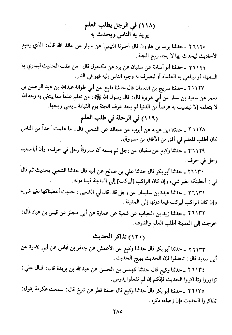 26128 - حَدَّثَنَا ابْنُ عُيَيْنَةَ، عَنْ أَيُّوبَ، عَنْ مُجَالِدٍ، عَنِ الشَّعْبِيِّ، قَالَ: «§مَا عَلِمْتُ أَحَدًا مِنَ النَّاسِ كَانَ أَطْلَبَ لِلْعِلْمِ فِي أُفُقٍ مِنَ الْآفَاقِ مِنْ مَسْرُوقٍ»