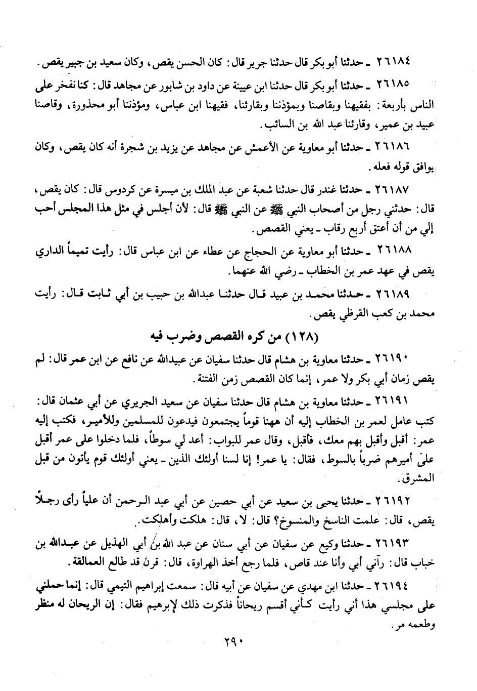 26184 - حَدَّثَنَا أَبُو بَكْرٍ قَالَ: حَدَّثَنَا جَرِيرٌ، قَالَ: «كَانَ §الْحَسَنُ يَقُصُّ، وَكَانَ سَعِيدُ بْنُ جُبَيْرٍ يَقُصُّ»