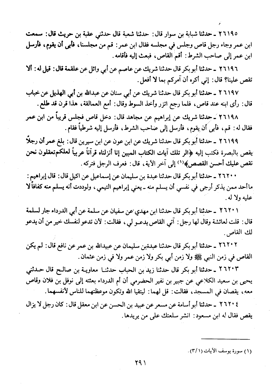 26199 - حَدَّثَنَا أَبُو بَكْرٍ قَالَ: حَدَّثَنَا شَرِيكٌ، عَنِ ابْنِ عَوْنٍ، عَنِ ابْنِ سِيرِينَ، قَالَ: بَلَغَ عُمَرَ أَنَّ رَجُلًا يَقُصُّ بِالْبَصْرَةِ فَكَتَبَ إِلَيْهِ: {§الر تِلْكَ آيَاتُ الْكِتَابِ الْمُبِينِ إِنَّا أَنْزَلْنَاهُ قُرْآنًا عَرَبِيًّا لَعَلَّكُمْ تَعْقِلُونَ نَحْنُ نَقُصُّ عَلَيْكَ أَحْسَنَ الْقَصَصِ} [يوسف: 2] إِلَى آخِرِ الْآيَةِ، قَالَ: فَعَرَفَ الرَّجُلُ فَتَرَكَهُ