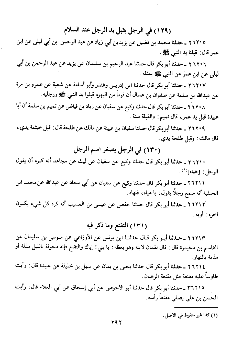 26209 - حَدَّثَنَا أَبُو بَكْرٍ قَالَ: حَدَّثَنَا سُفْيَانُ بْنُ عُيَيْنَةَ، عَنْ مَالِكٍ، عَنْ طَلْحَةَ، قَالَ: «§قَبَّلَ خَيْثَمَةُ يَدِي»، قَالَ مَالِكٌ: وَقَبَّلَ طَلْحَةُ يَدِي "