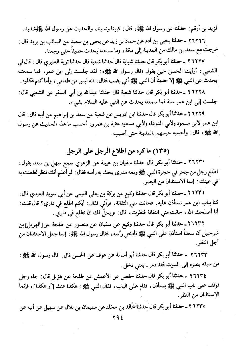 26232 - حَدَّثَنَا أَبُو بَكْرٍ قَالَ: حَدَّثَنَا وَكِيعٌ، عَنْ سُفْيَانَ، عَنْ مَنْصُورٍ، عَنْ طَلْحَةَ، عَنِ الْهُذَيْلِ بْنِ شُرَحْبِيلَ: أَنَّ سَعْدًا، اسْتَأْذَنَ عَلَى النَّبِيِّ صَلَّى اللهُ عَلَيْهِ وَسَلَّمَ فَأَدْخَلَ رَأْسَهُ، فَقَالَ رَسُولُ اللَّهِ صَلَّى اللهُ عَلَيْهِ وَسَلَّمَ: «§إِنَّمَا جُعِلَ الِاسْتِئْذَانُ مِنْ أَجْلِ النَّظَرِ»