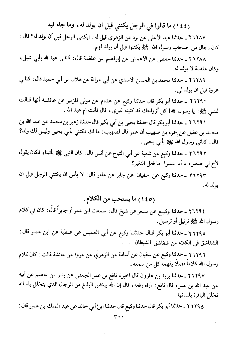 26293 - حَدَّثَنَا وَكِيعٌ، عَنْ سُفْيَانَ، عَنْ جَابِرٍ، عَنْ عَامِرٍ، قَالَ: «§لَا بَأْسَ أَنْ يَكْتَنِيَ الرَّجُلُ قَبْلَ أَنْ يُولَدَ لَهُ»